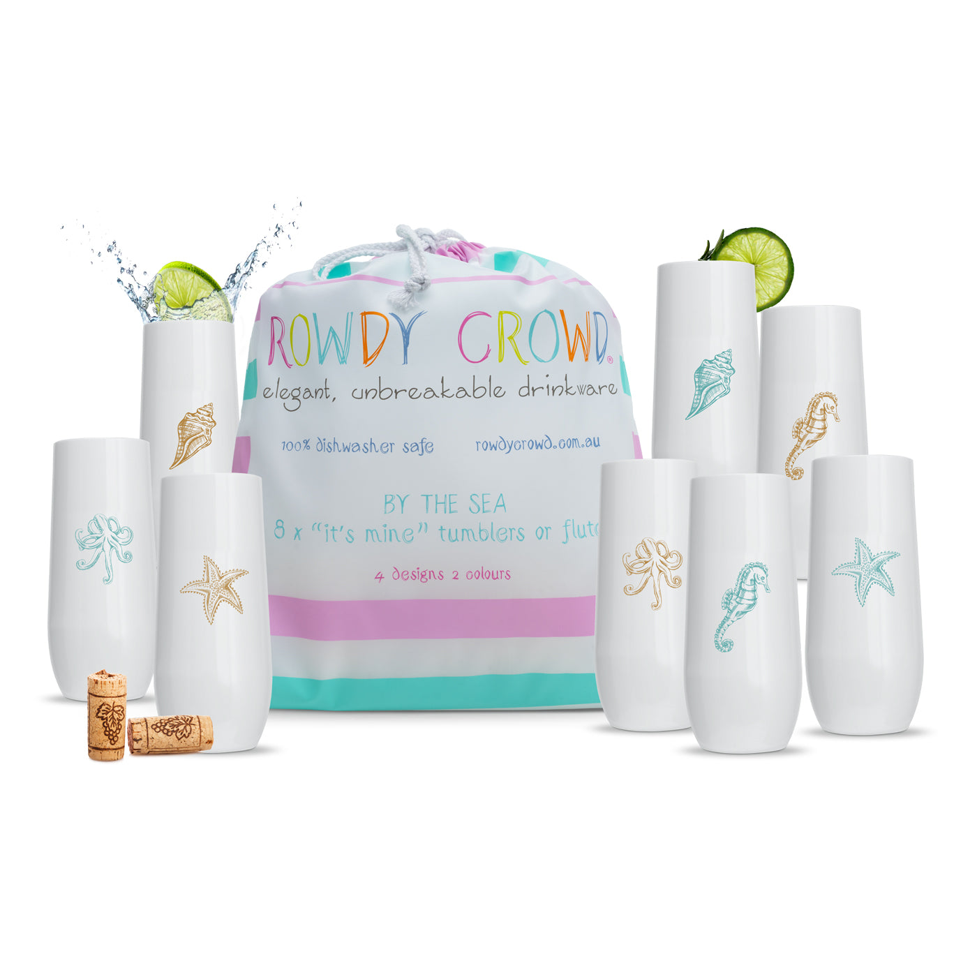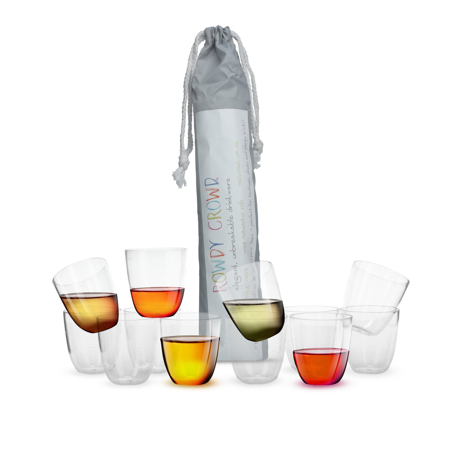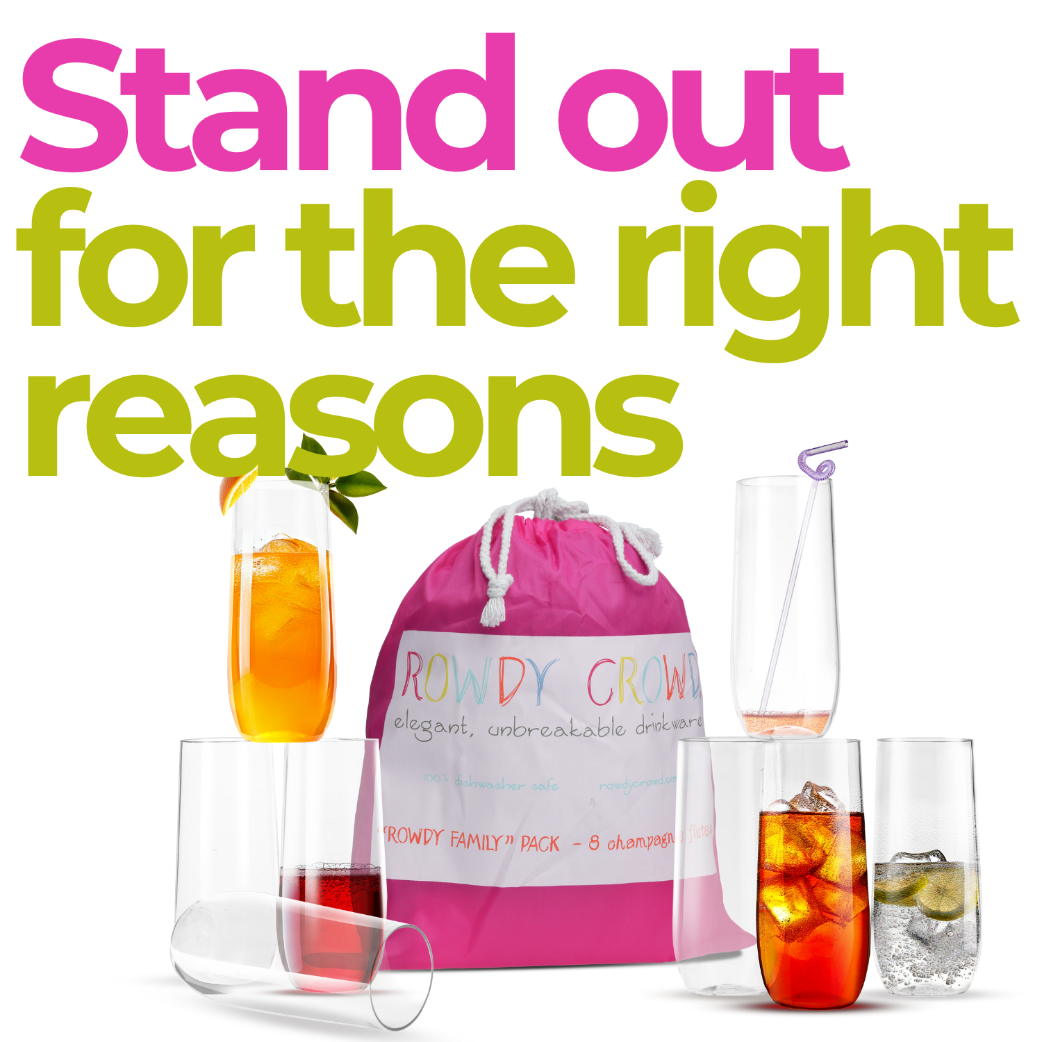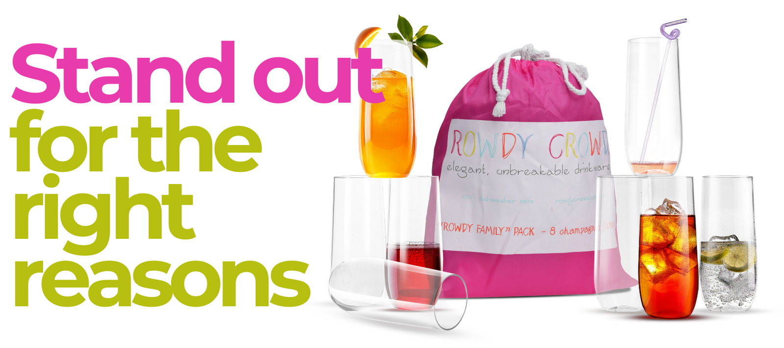 Rowdy Crowd drinkware is made from premium BPA-free Tritan™, a tough, crystal-clear material that’s fully dishwasher safe and built to last. Our unbreakable range of stemless, reusable wine tumblers, champagne flutes, beer schooners and gin balloons are designed for real life celebrations.