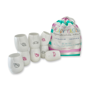 8 x “Rowdy By The Sea” printed wine tumblers. Every cup is printed with a different colour, symbol or both!