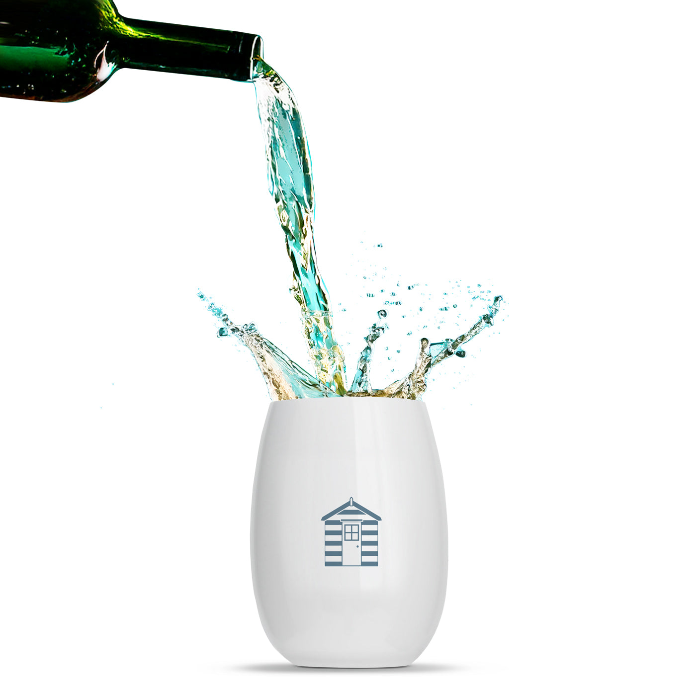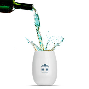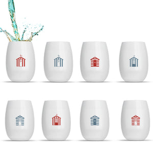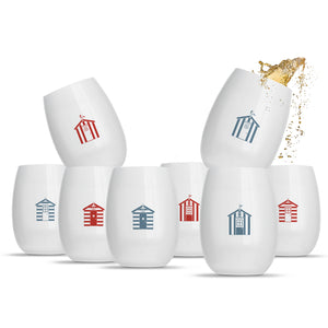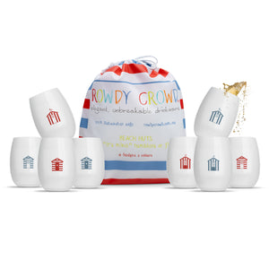 8 x “Rowdy Beach Huts” printed wine tumblers. Every cup is printed with a different colour, symbol or both!