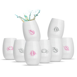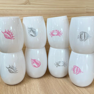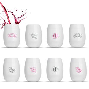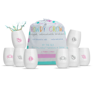 8 x “Rowdy By The Sea” printed wine tumblers. Every cup is printed with a different colour, symbol or both!