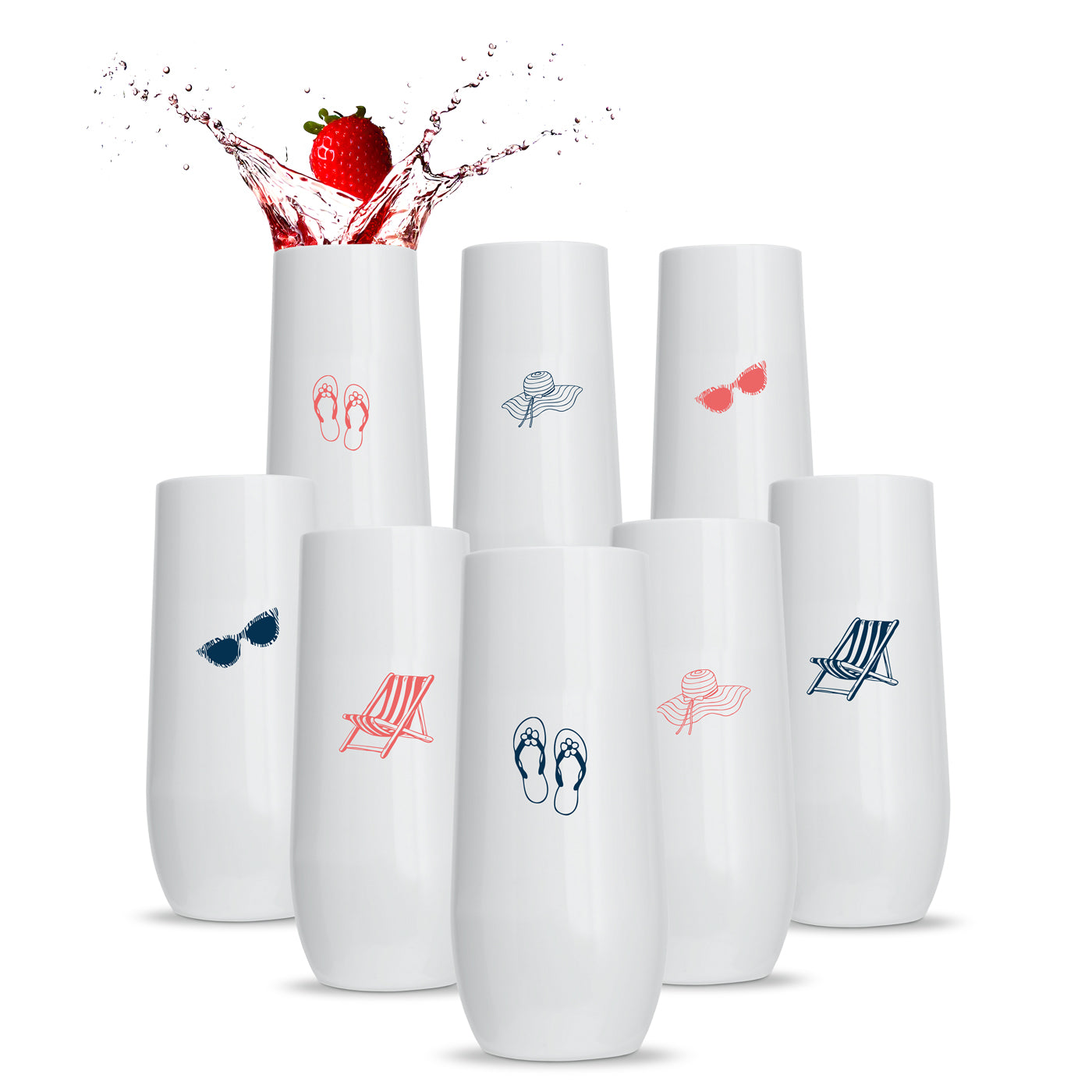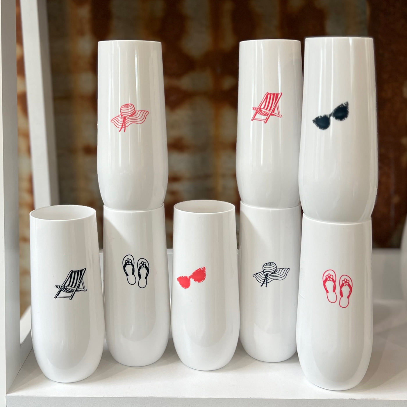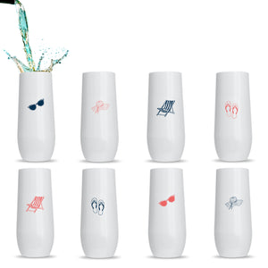 8 x “Rowdy Summer Vibes” printed champagne flutes. Every cup is printed with a different colour, symbol or both!